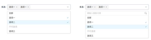 舉例來(lái)說:下面兩個(gè)選擇器(qì),兩個(gè)表面上(shàng)目的看起來(lái)都是進行(xíng)選擇項選擇,但(dàn)右邊的選擇器(qì)帶有(yǒu)搜索框,适合選擇項數(shù)據龐大(dà)時(shí)的進行(xíng)搜索選擇,左邊的适合選擇項數(shù)據量不大(dà)時(shí)進行(xíng)直接選擇,所使用的場(chǎng)景并不相同,所以不能進行(xíng)删減。