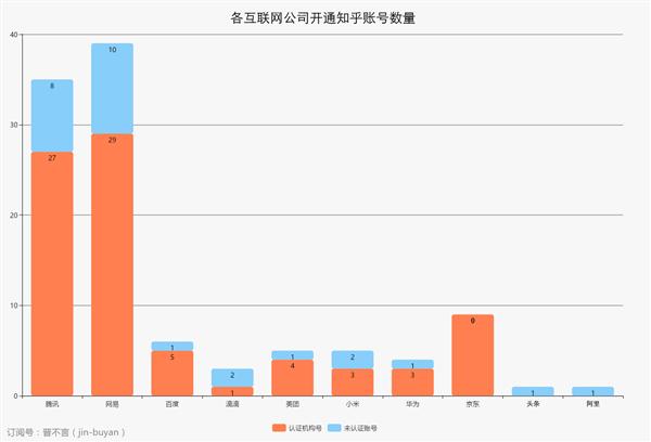 在爬取騰訊機構号數(shù)據之前,我先統計(jì)了各大(dà)互聯網公司開(kāi)通(tōng)知乎機構号的數(shù)量情況,其中網易認證的機構号有(yǒu) 29 個(gè)、騰訊有(yǒu) 27 個(gè),遙遙領先于其他互聯網公司;各公司還(hái)有(yǒu)一些(xiē)未認證的機構号或普通(tōng)賬号,多(duō)數(shù)近期無活躍動态,基本處于停止運營狀态,不計(jì)入分析。