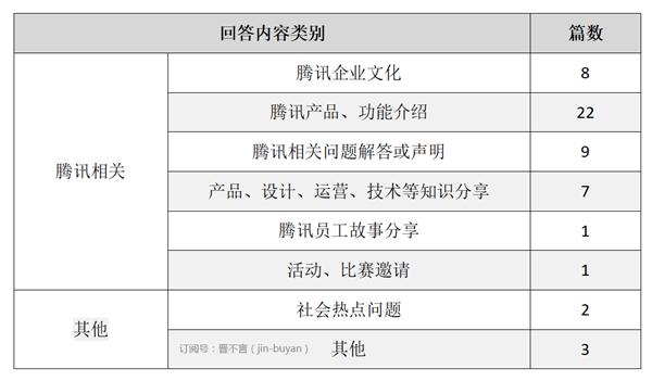 還(hái)有(yǒu)很(hěn)大(dà)比例內(nèi)容關于開(kāi)發、技(jì)術(shù),在問題回答(dá)部分中占比很(hěn)高(gāo)的騰訊産品介紹類、騰訊企業文化類內(nèi)容,在文章欄目下出現較少(shǎo)。