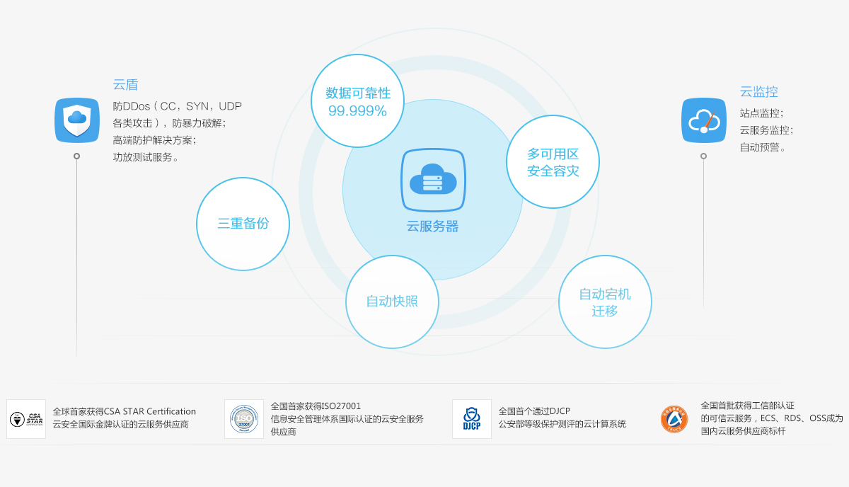 阿裏雲提供“異地雙活”和(hé)“兩地三中心”的災備解決方案,當一處系統因意外(如火(huǒ)災、地震等)停止工作(zuò)時(shí),整個(gè)應用系統可(kě)切換到另一處,繼續對外提供服務