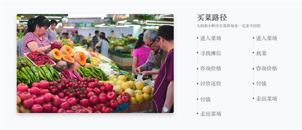 還(hái)原大(dà)媽從進入菜場(chǎng),到最後買完菜離開(kāi)菜場(chǎng),整個(gè)鏈路上(shàng)所接觸到的每一個(gè)節點,這樣我們就能知道(dào)大(dà)媽是習慣在同一個(gè)攤位上(shàng)買,還(hái)是每次都貨比三家(jiā)的買,還(hái)包括她買菜的偏好,量的多(duō)少(shǎo),整體(tǐ)時(shí)間(jiān),還(hái)價的手段、積極性,從而推理(lǐ)出今天家(jiā)裏可(kě)能有(yǒu)幾個(gè)人(rén)吃(chī)飯,對比前兩天買菜的偏好、多(duō)少(shǎo),推斷可(kě)能今天來(lái)了新的客人(rén)或者可(kě)能要屯起來(lái)等信息——開(kāi)個(gè)玩笑,舉個(gè)例子。