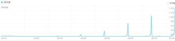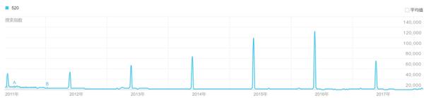 通(tōng)過百度指數(shù)可(kě)以清晰的看出: 520 的關注度有(yǒu)着極強的周期性,從 2011 到 2017 總共出現了 7 個(gè)明(míng)顯的尖峰,而這些(xiē)尖峰的位置無一不是位于 5 月 20 日。