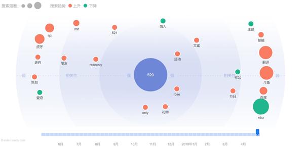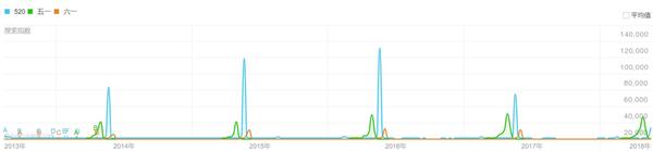 今年的曲線暫時(shí)還(hái)不是很(hěn)完整,但(dàn)是通(tōng)過數(shù)據可(kě)以發現: 5 月初起 520 的搜索指數(shù)就有(yǒu)了明(míng)顯的上(shàng)升,相信最終會(huì)與往年一樣形成一個(gè)很(hěn)尖的峰。