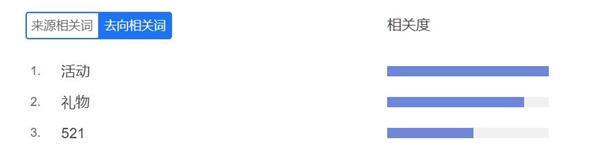 去向相關詞語的前三名則是活動、禮物以及521。可(kě)以看出:大(dà)多(duō)數(shù)人(rén)在搜索了 520 之後緊接着就開(kāi)始考慮禮物了,還(hái)有(yǒu)不少(shǎo)的人(rén)順便也搜索了521。