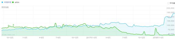 上(shàng)圖為(wèi)哔哩哔哩和(hé)AcFun的搜索指數(shù),從中可(kě)以發現:哔哩哔哩最初的熱度是不如AcFun的,在 2017 年以前兩者的搜索指數(shù)互有(yǒu)勝負。