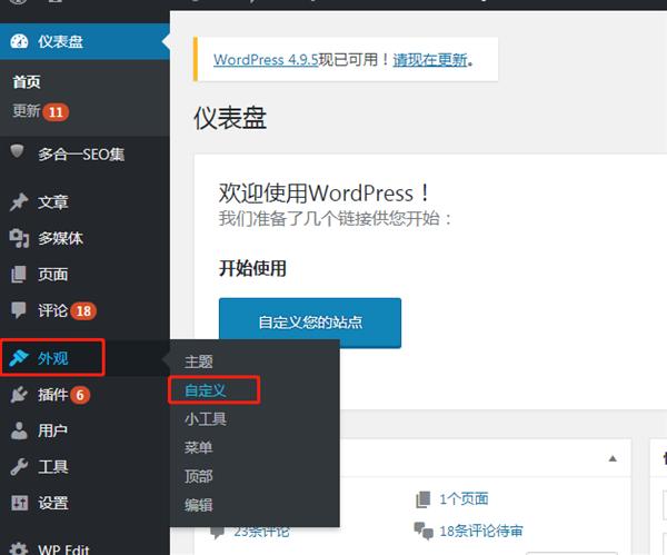 (1)進入wordpress網站(zhàn)後台,點擊“外觀”——“自定義”,進入主題設置頁面。