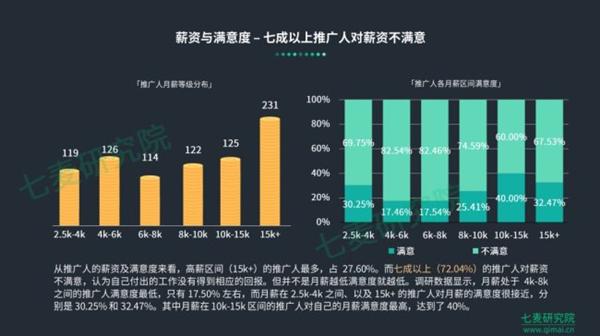 在這樣的大(dà)環境下,娛樂類App推廣人(rén)的收入卻顯得(de)十分可(kě)觀,中等薪資區(qū)間(jiān)(4k-8k)人(rén)數(shù)最多(duō),低(dī)薪區(qū)間(jiān)(2.5k-4k)占比最少(shǎo)。另外,從地區(qū)方面看來(lái),北京平均薪資水(shuǐ)平領跑全國,上(shàng)海緊随其後;而廣東的薪資落後于浙江,排名第4。不過七成以上(shàng)(72.04%)的推廣人(rén)對薪資不滿意,認為(wèi)自己付出的工作(zuò)沒有(yǒu)得(de)到相應的回報,其中月薪低(dī)于8k的推廣人(rén)約42.89%。