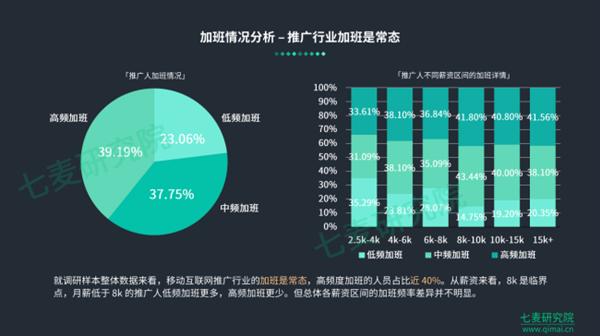 根據七麥研究院(原 ASO100 情報中心)的分析,移動互聯網推廣行(xíng)業加班是常态,高(gāo)頻度加班的推廣人(rén)占比近 40%,加班最多(duō)的是負責遊戲、乙方/渠道(dào)的推廣人(rén),而二者收入則排最後兩名,加班最少(shǎo)的是推廣金融類 App 的從業者;其中“北、上(shàng)、廣”加班情況最為(wèi)嚴重,浙江省、湖(hú)北省緊随其後;四川省的推廣人(rén)加班頻率最低(dī)。
