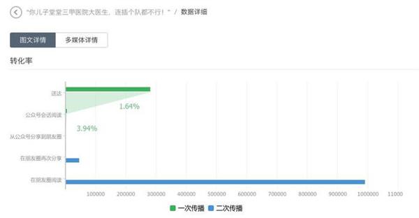 以微信平台為(wèi)例,內(nèi)容的第一次傳播在公衆号,第二次傳播在朋友(yǒu)圈,以目前的趨勢來(lái)看,公衆号的打開(kāi)率越來(lái)越低(dī),大(dà)部分內(nèi)容依賴的是朋友(yǒu)圈的二次傳播,所以能夠引起二次傳播的內(nèi)容才能最終的獲得(de)好的傳播。要想引爆二次傳播,其實就是激發第一批讀者的分享轉發的熱情,這就靠的是文章內(nèi)容本身,好的內(nèi)容自然會(huì)獲得(de)更多(duō)的分享。掌上(shàng)醫(yī)訊 2016 年度最高(gāo)閱讀數(shù)的文章《“你(nǐ)兒子堂堂三甲醫(yī)院大(dà)醫(yī)生(shēng),連插個(gè)隊都不行(xíng)!”》,短(duǎn)短(duǎn)一周時(shí)間(jiān),閱讀次數(shù)超過 100 萬,被幾十家(jiā)媒體(tǐ)瘋狂轉載,作(zuò)為(wèi)該文作(zuò)者張雨雨醫(yī)生(shēng),用自己真實發生(shēng)的故事,情真意切的反映的一名醫(yī)生(shēng)在面對熟人(rén)走後門(mén)的選擇和(hé)遭遇,說出了大(dà)家(jiā)的心聲,引起了醫(yī)生(shēng)群體(tǐ)的共鳴。最終該文章被接近 6 萬人(rén)分享,引爆了在朋友(yǒu)圈裏的二次傳播,看下圖數(shù)據能夠直觀的反映。