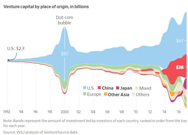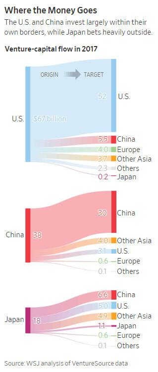 雖然日本的軟銀是亞洲最大(dà)的投資者之一,該公司借助來(lái)自中東的資金創辦了全球最大(dà)的科技(jì)投資基金,但(dàn)影(yǐng)響最大(dà)的還(hái)是中國的投資活動。
