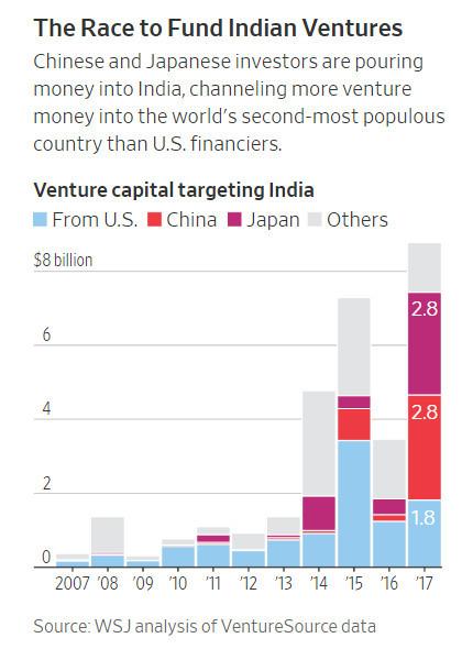 在為(wèi)印度企業提供資金的競争,中日兩國投資者紛紛湧入該國,比美國金融投資者向世界第二人(rén)口大(dà)國投入更多(duō)的風險資金