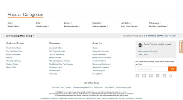 在上(shàng)面的 The Home Depot 的網頁中,頁腳就包含了多(duō)層次的頁腳導航。其中包含了熱門(mén)的分類(如果你(nǐ)沒有(yǒu)找到想要的東西可(kě)以試着在這裏找找),然後是客戶服務的鏈接組(如果你(nǐ)需要額外的服務),以及相關的資源,公司的責任和(hé)其他的行(xíng)為(wèi)召喚元素。最後,頁腳中還(hái)包含了其他相關品牌的鏈接,版權信息和(hé)協議條款。