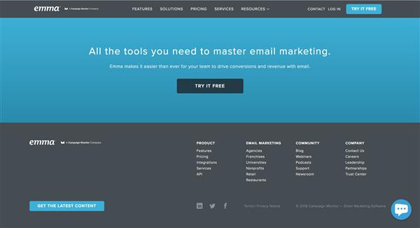 上(shàng)面是電(diàn)子郵件服務供應商 Emma 的網站(zhàn)頁腳設計(jì),其中包含一個(gè)明(míng)顯的行(xíng)為(wèi)召喚按鈕,所搭配的文案和(hé)整個(gè)品牌的調性保持一緻,仿佛他們的營銷團隊在向你(nǐ)問好。頁腳的元素和(hé)元素之間(jiān)留有(yǒu)足夠多(duō)的空(kōng)間(jiān),确保整體(tǐ)的舒适感。